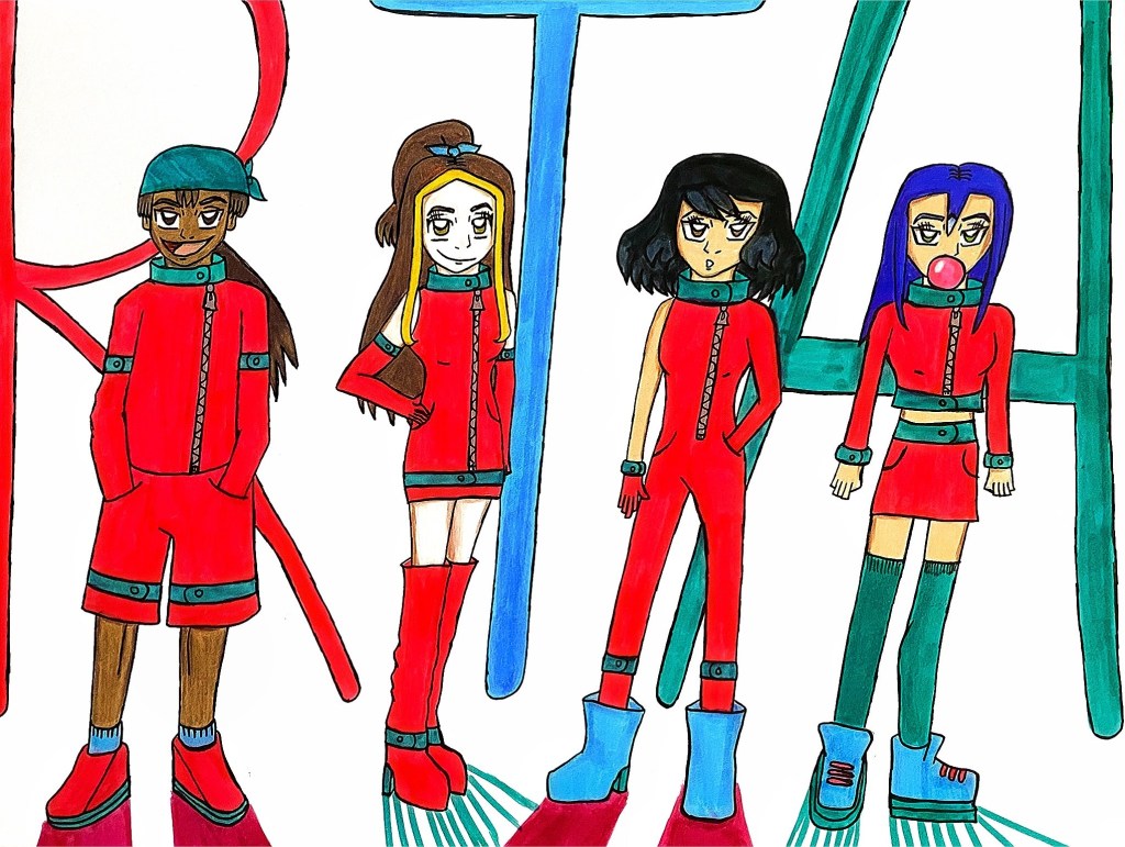 In downtown Ringling City, the Akshay Arora show was being held at 21st Tower. Attendees were entering one after the other. And Krystal was determined to get the group in. The plan was in motion. While Rainer was planning to enter the building from the opposite side, Krystal was in charge of getting the others inside the show. It only took her a few hours prior to the show, but she was able to make a legit invitation for them to get in and she went the extra mile by creating matching outfits for them all to wear. The outfits had a red and teal color palette with variations on the same design. Krystal’s was a dress with over-the-knee boots, Rey’s was a set with a jacket and shorts, Sana’s was a one shoulder jumpsuit, and Akira’s was a cropped jacket with a matching skirt. The four of them were standing in line to enter the building for the show.