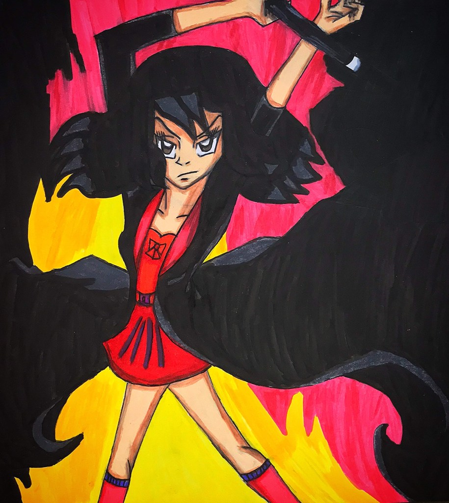 But when they looked inside, their mouths dropped wide open at what they saw. Right by Headmaster Devil’s desk was a tall, elegant looking woman who wore a high slit dress in black that had long sleeved lacey sleeves. She had beautiful shiny red hair and her lips were bright red. She stood proud like the beauty that she was as she tapped her long red finger nails on the desk. And Rey and Neil couldn’t stop staring at her. Headmaster Devil went up to the woman and said, “Shaina! What are you doing here?!”